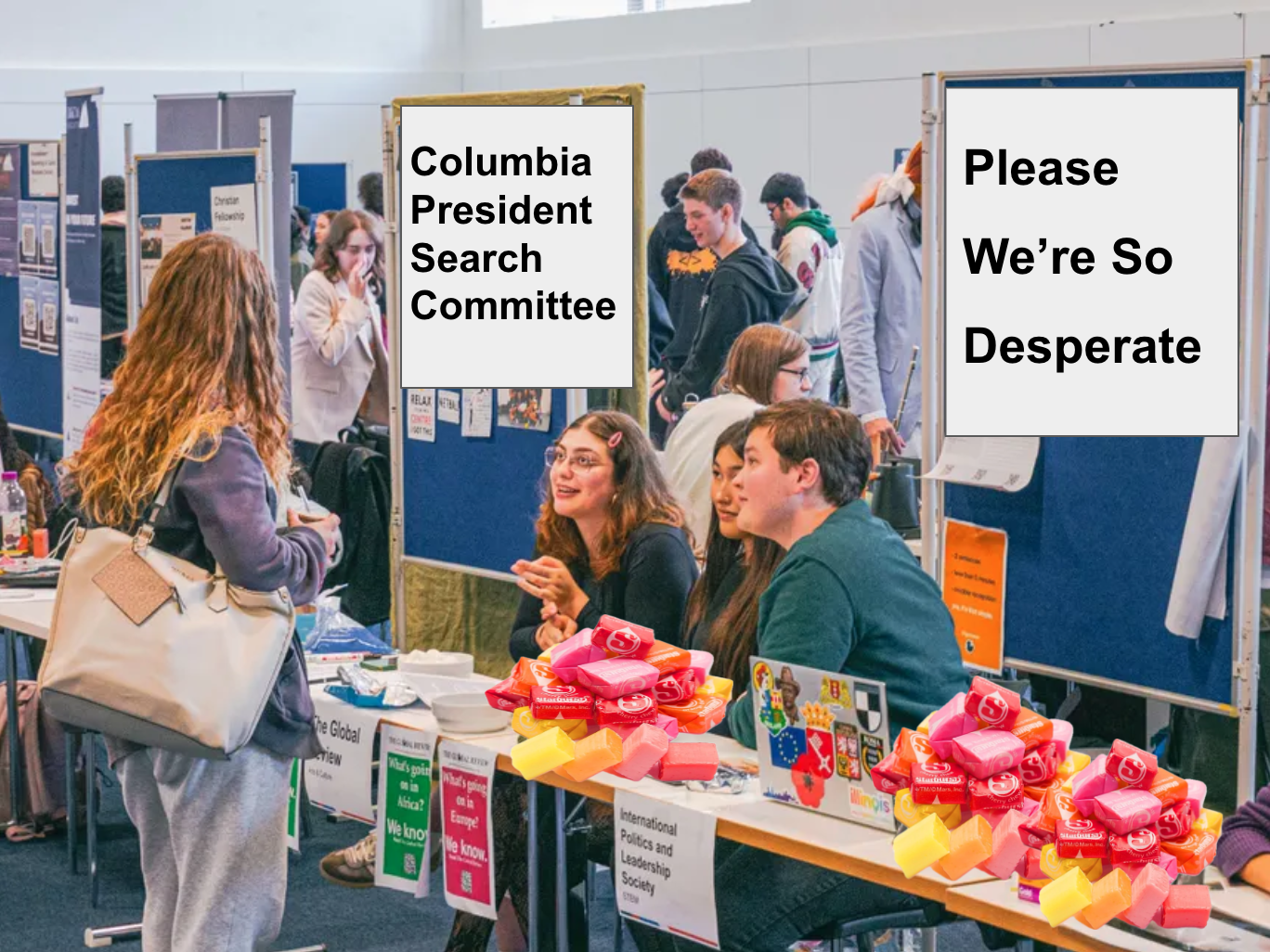 This year’s annual career fair showcased a number of exciting career opportunities for current Columbia students, but one position stood out from the rest: the “University President” stand established by the Columbia administration. Months into the search for a permanent University President, the administration has resorted to outside-the-box recruiting techniques, including their career fair table offering informational pamphlets, pens, and loose Starbursts.