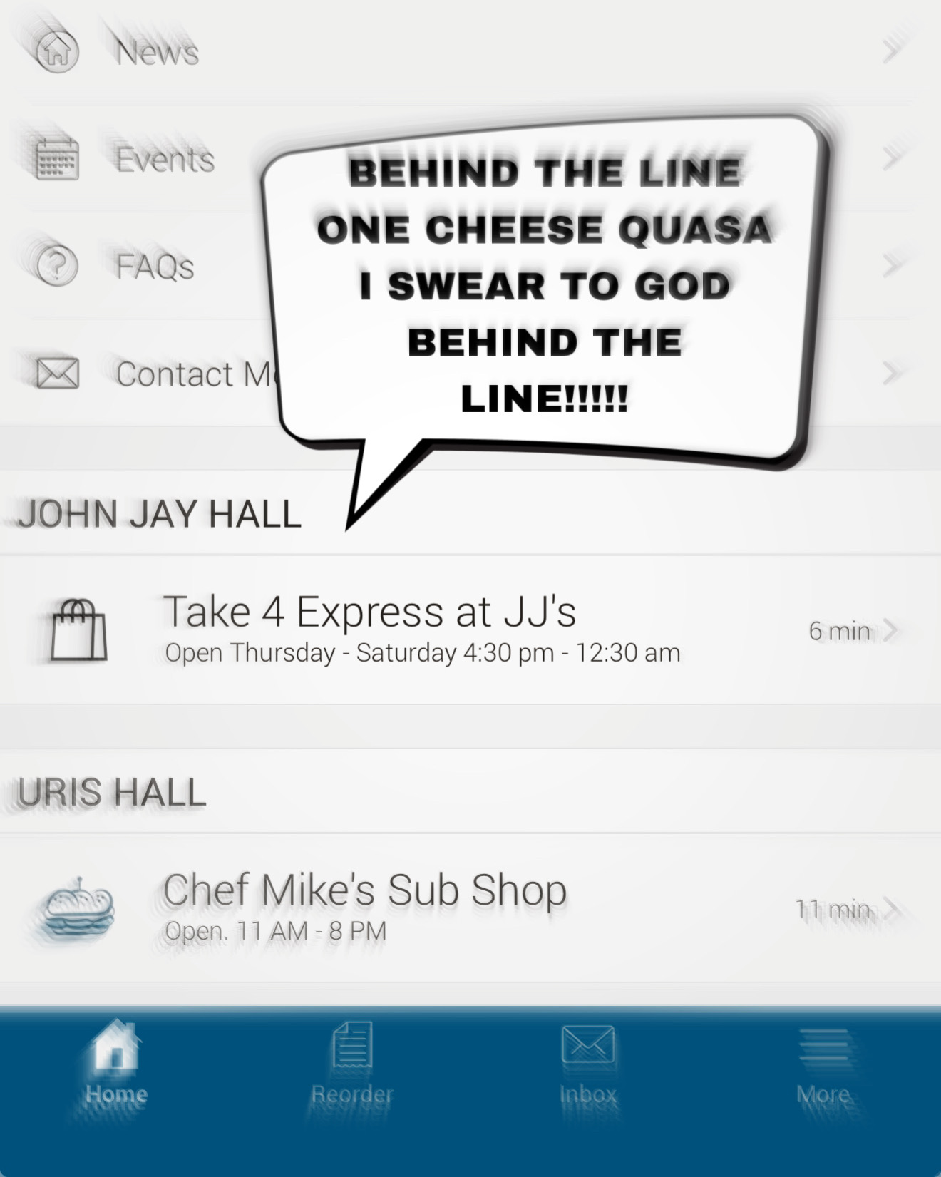 However, in a recent letter to Students and Staff, Columbia Dining explained that they understand students love of the JJ’s ambiance, and in an effort to make mobile ordering as comfortable as possible for students, they have added new realistic features, to mitigate the effects of FOMOOWIHAJJ (Fear Of Missing Out On What Is Happening At JJ’s). The app will be equipped with features such as voice recordings of “ONE LINE ONE LINE EXPRESS AND DINE IN ONE LINE” and “BEHIND THE LINE!”
